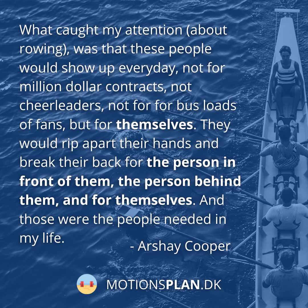What caught my attention (about rowing), was that these people would show up everyday, not for million dollar contracts, not cheerleaders, not for for bus loads of fans, but for themselves. They would rip apart their hands and break their back for the person in front of them, the person behind them, and for themselves. And those were the people needed in my life.