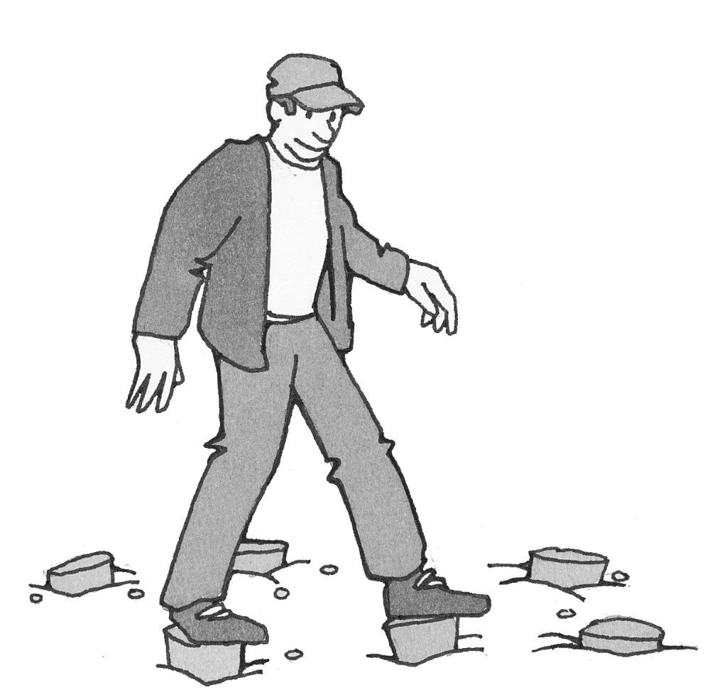Løb og hop mellem træstykker og/eller træstubbe uden at røre jorden. Denne øvelse kan varieres med en runde ”Jorden er giftig”. Balanceevne og kondition trænes.
