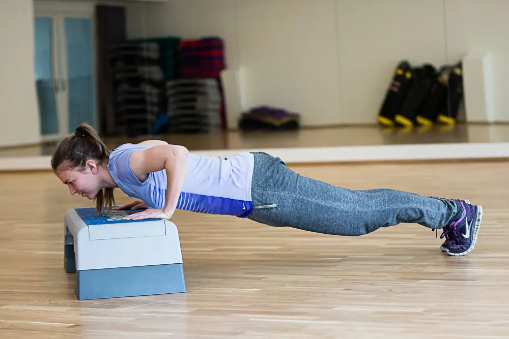 Placer hænderne på en bænk. Sænk brystet ned mod bænken med helt ret krop. Tilbage til udgangsposition.