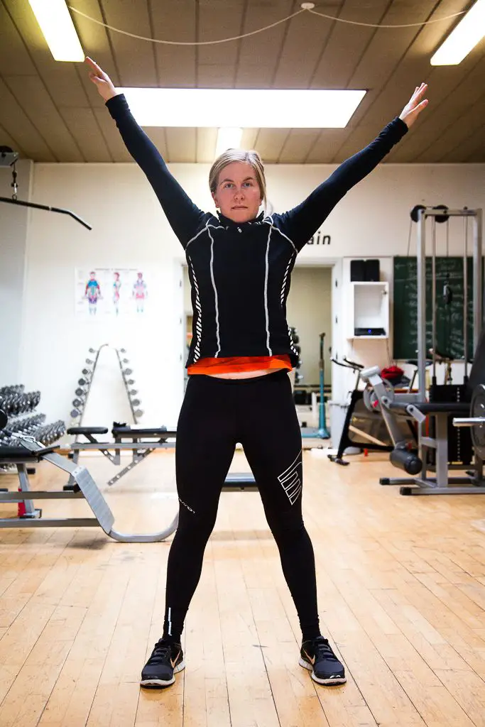 Gå ned i en dyb squat. Saml albuerne og hænderne foran kroppen. Når du rejser dig op lader du armene søge opad, mens du holder albuerne så tæt sammen som muligt og slutter med en stor cirkel med armene.
